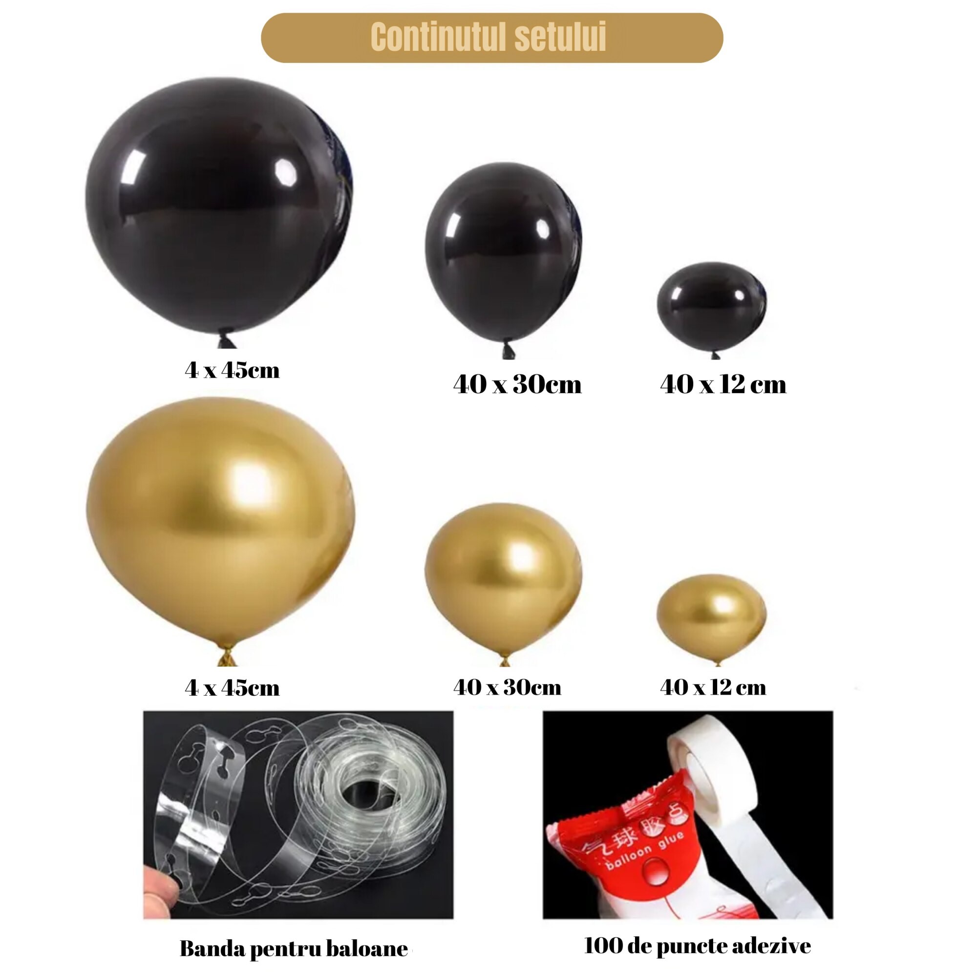 Set 170 baloane si accesorii pentru Aranjament tip Arcada, auriu/negru