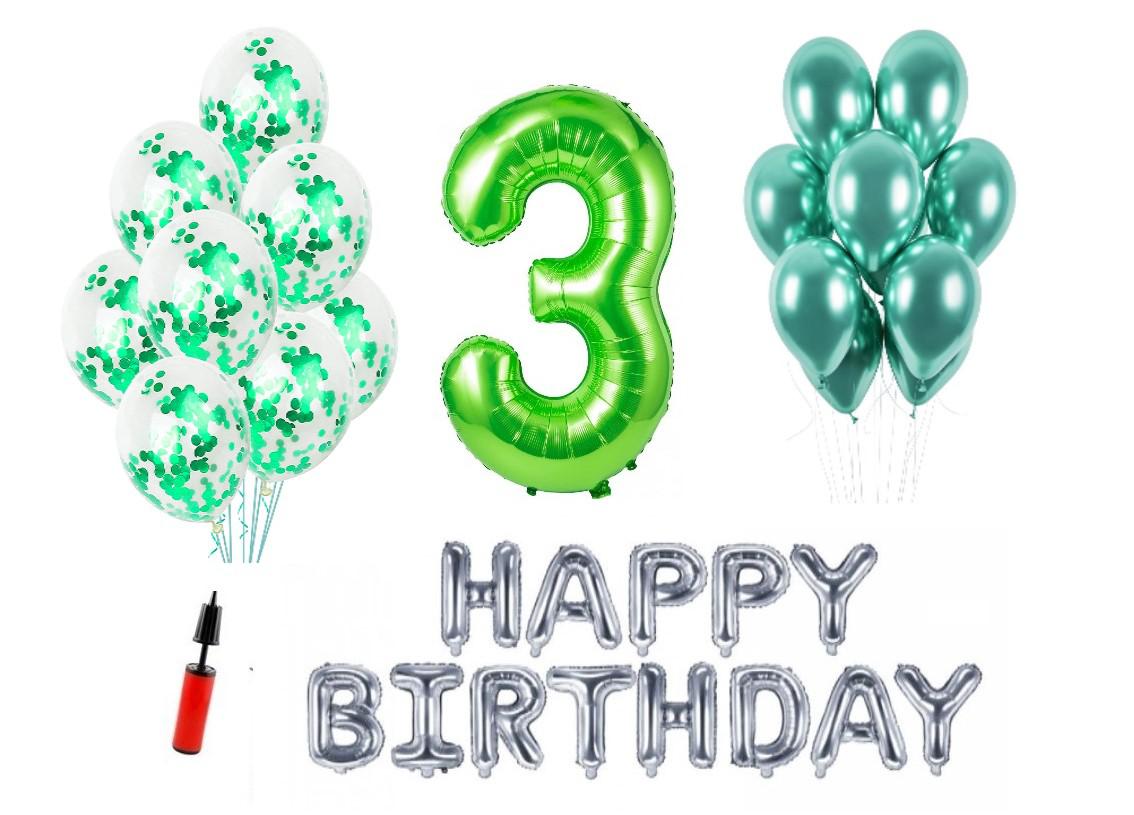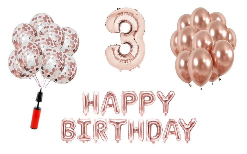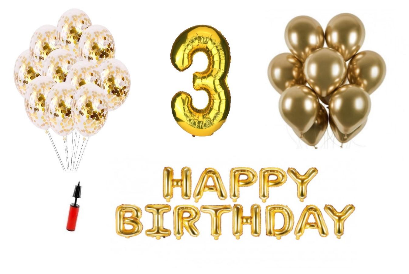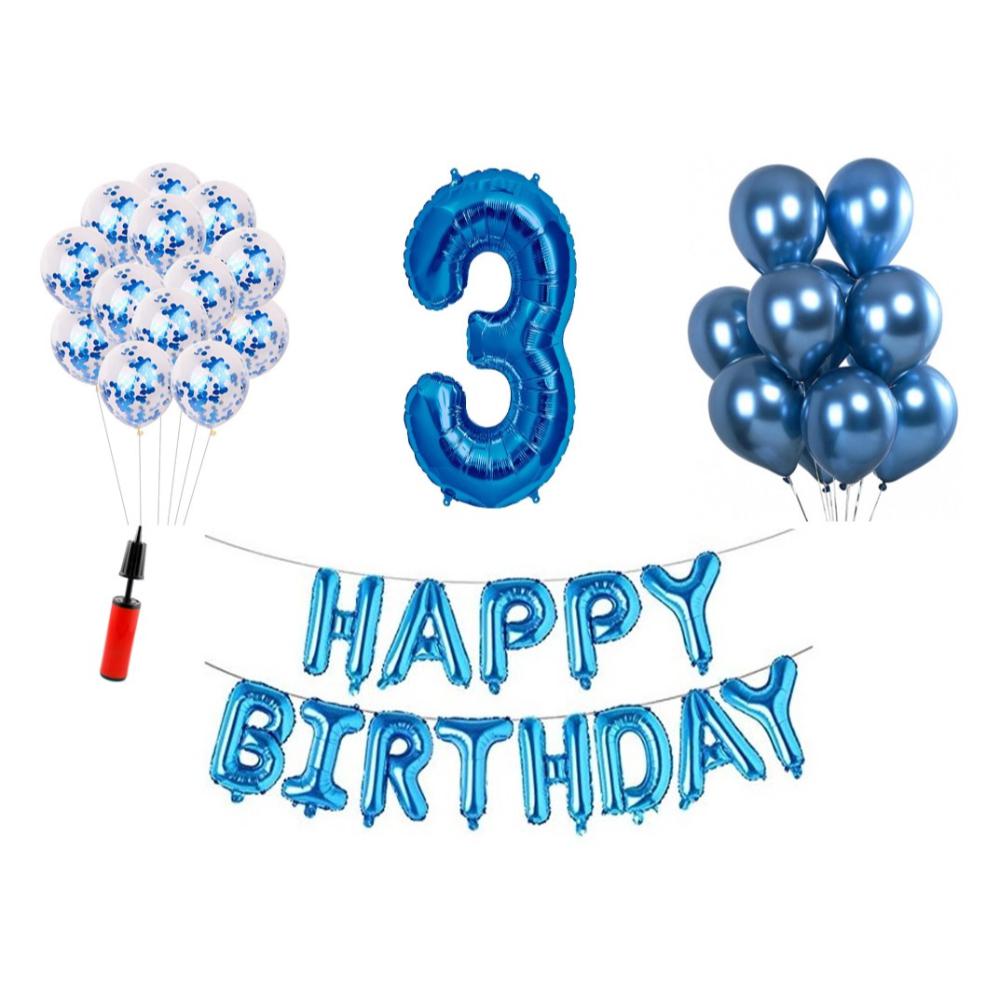 Set baloane Happy Birthday 3 ani Latex+Confetti+Pompa – Baloanele se pot umfla cu heliu sau aer.