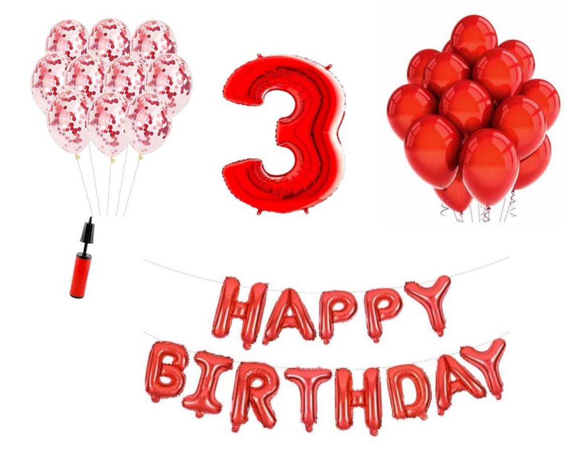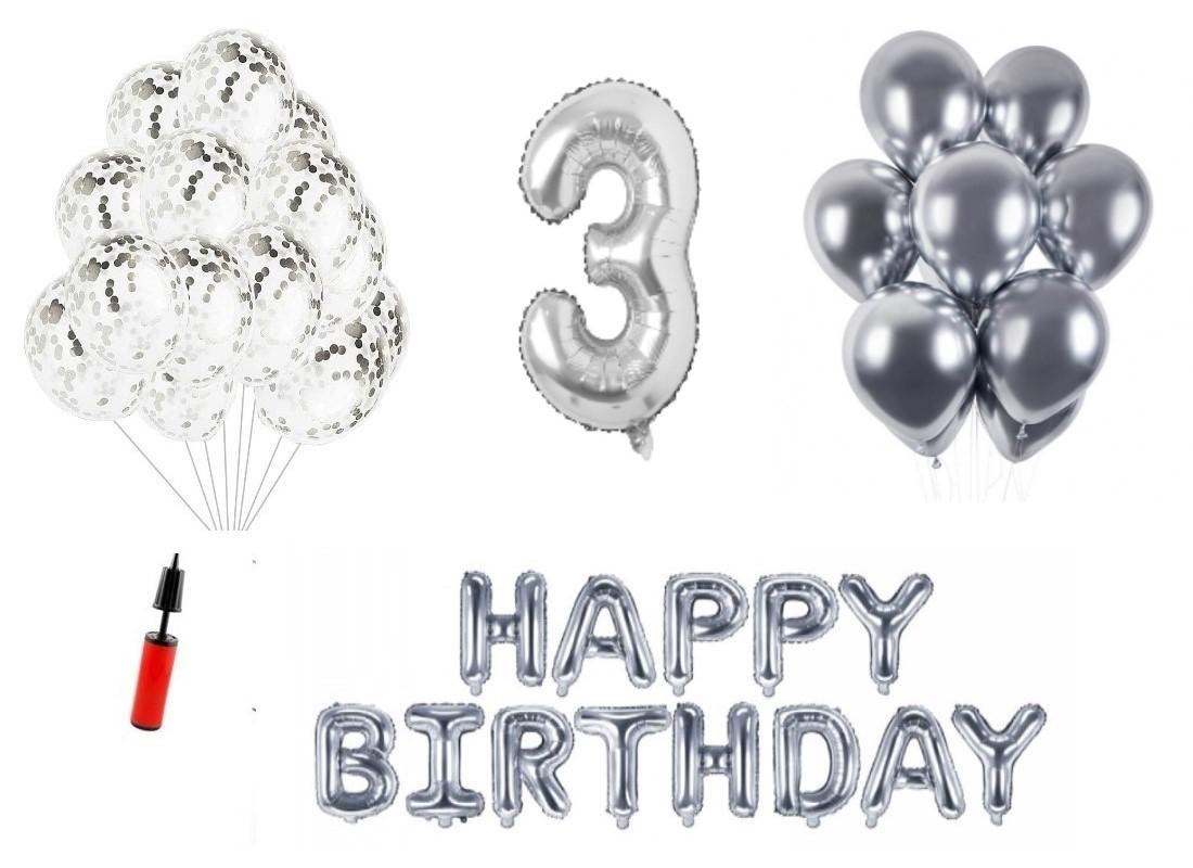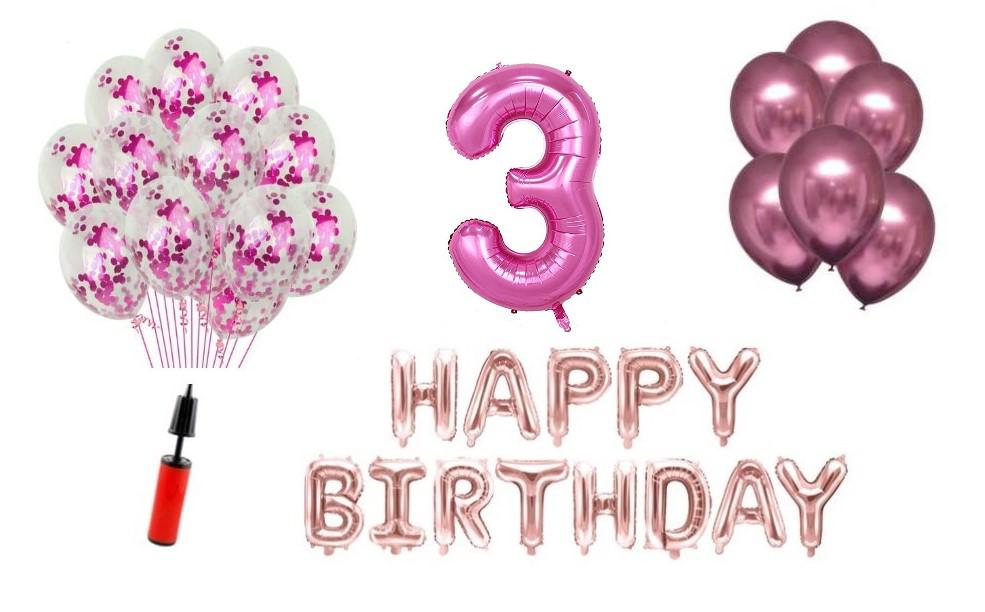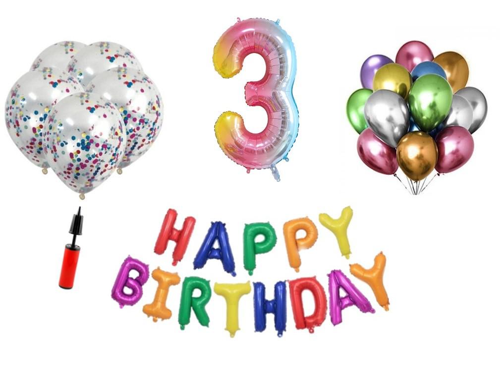 Set baloane Happy Birthday 3 ani Latex+Confetti+Pompa. Este cadoul ideal pentru orice aniversare sau petrecere.